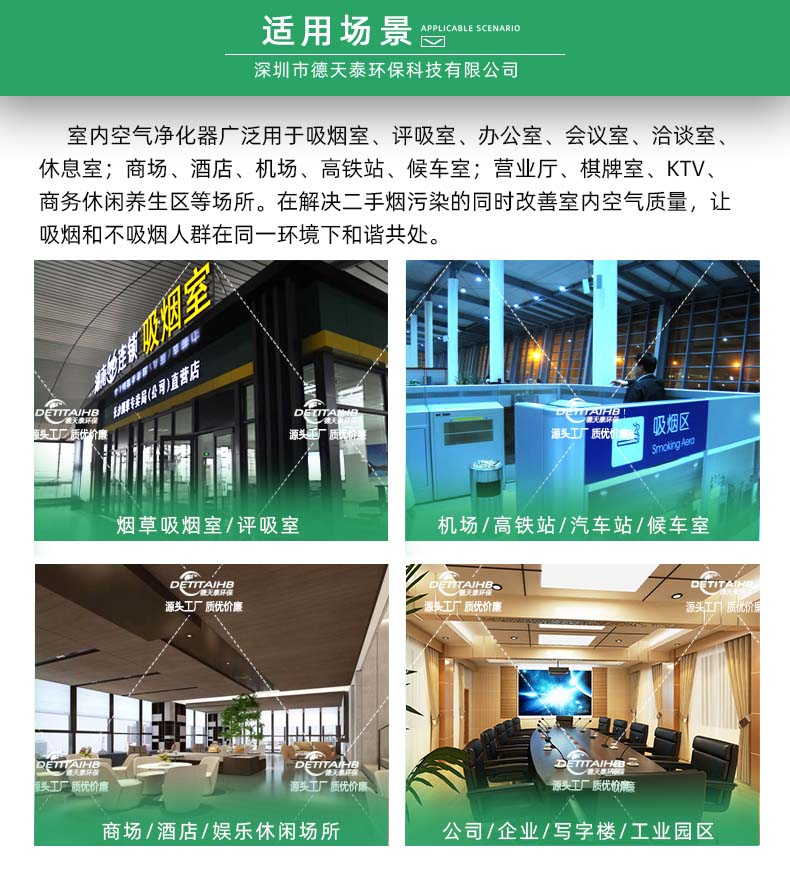 應用領(lǐng)域:會(huì )議室、休息室、吸煙室、營(yíng)業(yè)廳、煙草評吸室、機場(chǎng)、高鐵站、汽車(chē)站、商場(chǎng)、企業(yè)等香煙凈化場(chǎng)所